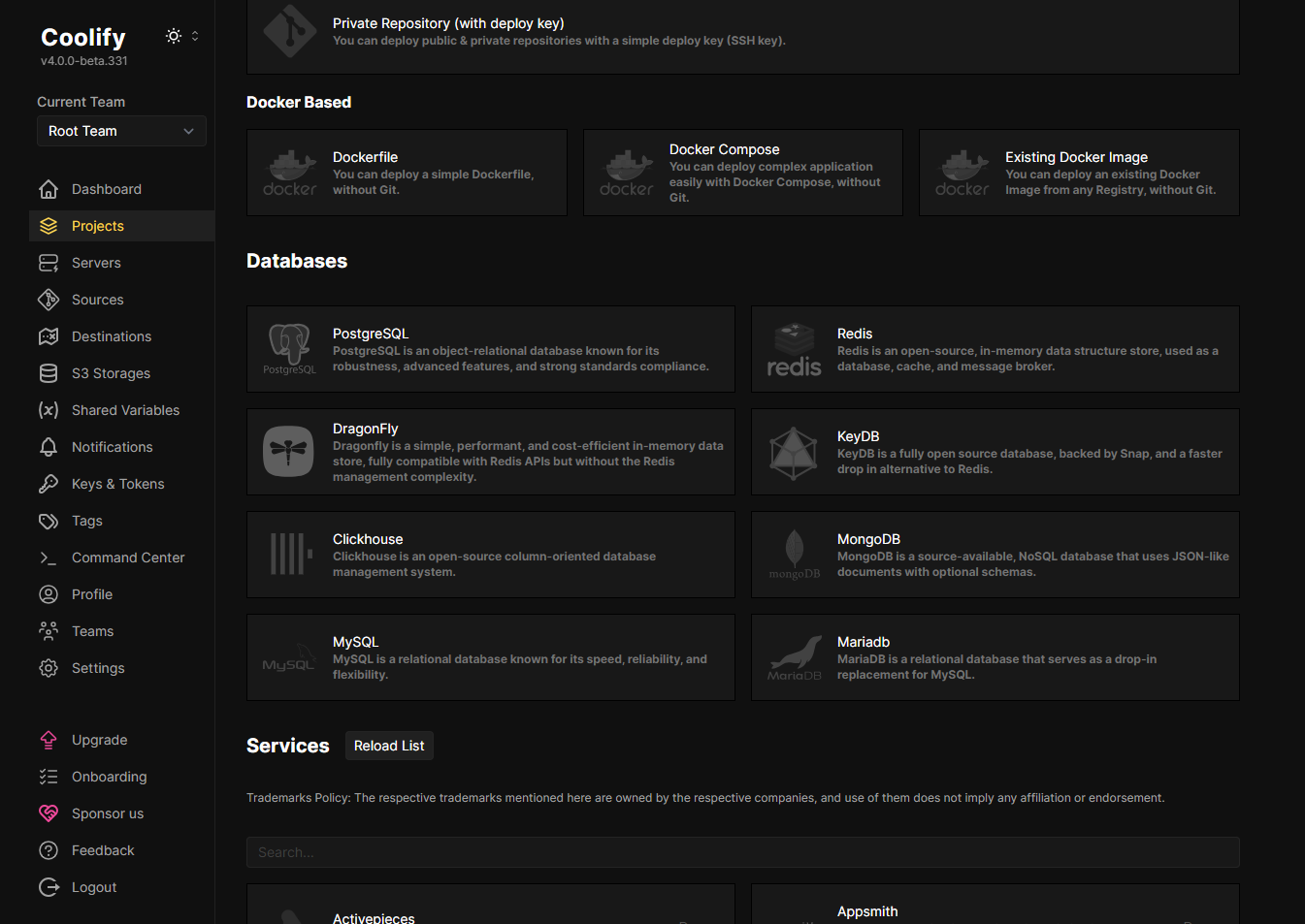 This installs Docker and runs the Coolify image. The entire process took about 5 minutes. After installation, Coolify provides a URL to complete the configuration. Once I registered, I was taken to the Coolify dashboard, ready to create a new project.