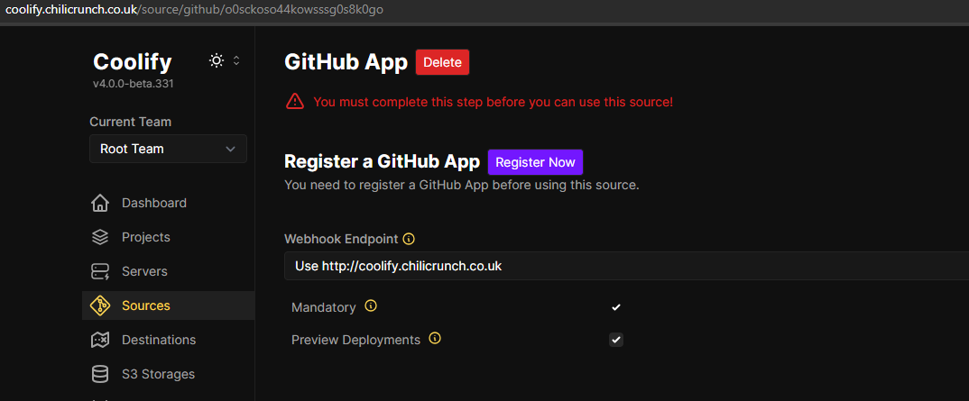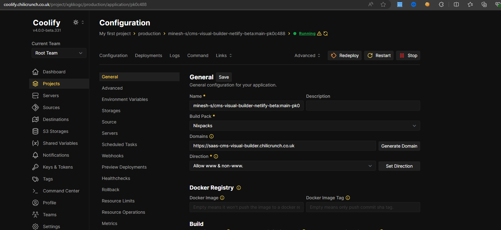 In Coolify’s settings, I configured the domain name for the control panel at http://coolify.chillicrunch.co.uk. I also set up Wildcard Subdomains to allow deployments to URLs like https://<my-project-name>.chilicrunch.co.uk/, similar to how Netlify and Vercel manage deployments.
