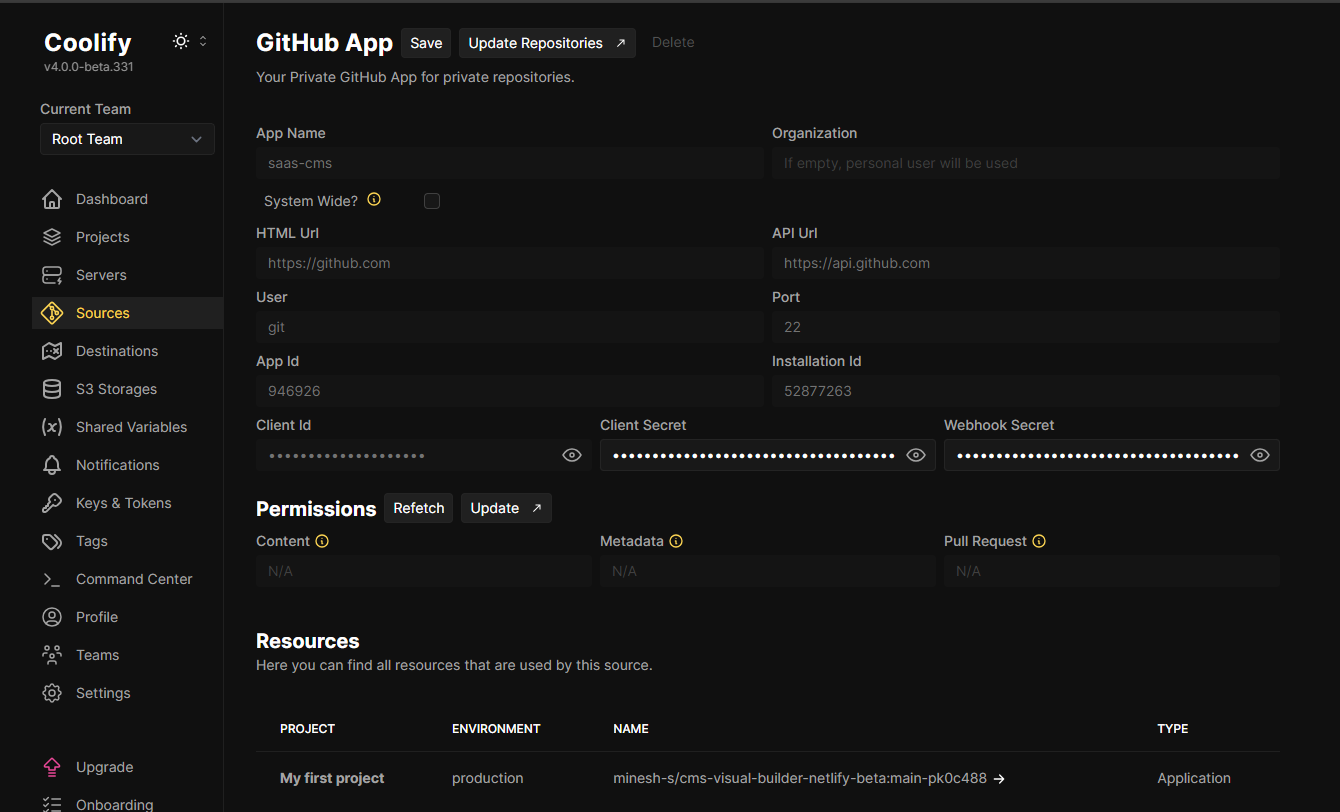To enable continuous deployment, I connected Coolify to my private GitHub repository. Coolify supports several Git sources, but for this example, I used GitHub. You can add your GitHub repo by navigating to Sources and clicking Add. The process requires setting up Client ID, Secret, and Webhook Secret, which are generated during the setup.