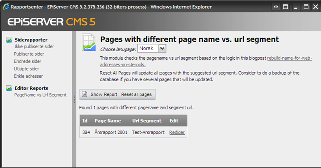 So, to help the editors in their daily work, I created a simple report which displays the pages that differ between the page name and the expected Url Segment. This report will give the editor a quick overview of the pages that differ. I don’t see how an editor can find these pages in a sensible time another way.