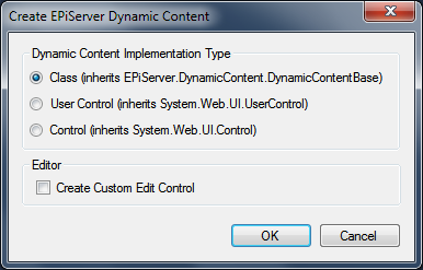 For Dynamic Content, you chose what type of component to create to render the content along with the option to create a custom Editor: