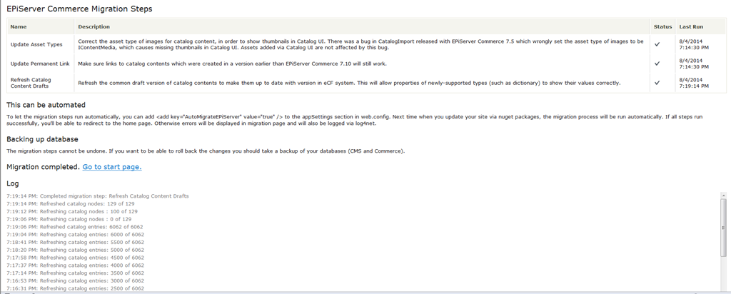 [New in 7.10.0] An update may have one or more migration steps that need to be executed in order for the site to work correctly. If so, any request to the site will be redirected to a migration page. In order to access it you need to be part of the "CommerceAdmins" role. From there it is possible to run the migration steps and track the progress. Once all steps have been completed successfully the redirects will stop, and the site will be back to normal.