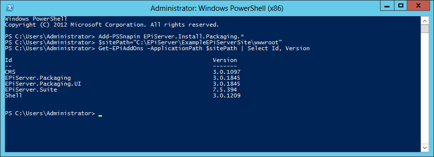 $apiPath = “C:\Program Files (x86)\EPiServer\Framework\7.5.394.2\Install\Tools” Get-EPiAddOns –ApplicationPath $sitePath –ApiPath $apiPath | Select Id, Version