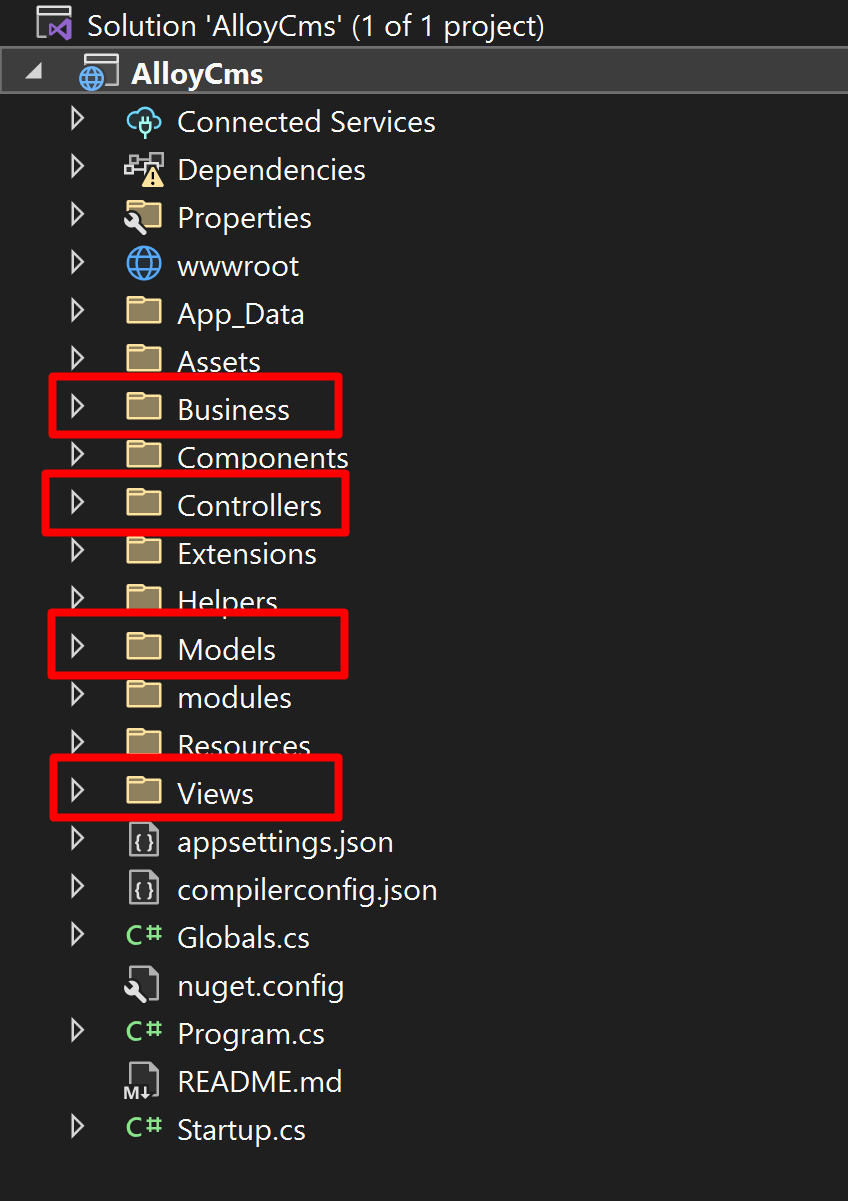 As CMS 12 is a pre-built application, we do not have the data access layer as described above, however as you can see from the screenshot below of the out-of-the-box AlloyCMS example, the way in which the code is structured does still have distinct horizontal layering.