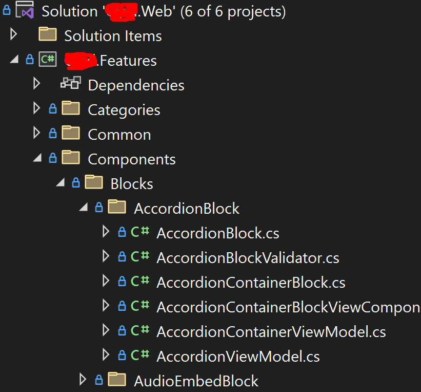 - AccordionContainerBlock.cs - this is the model class for the accordion container block content type (this block contains one or more accordion block content types)