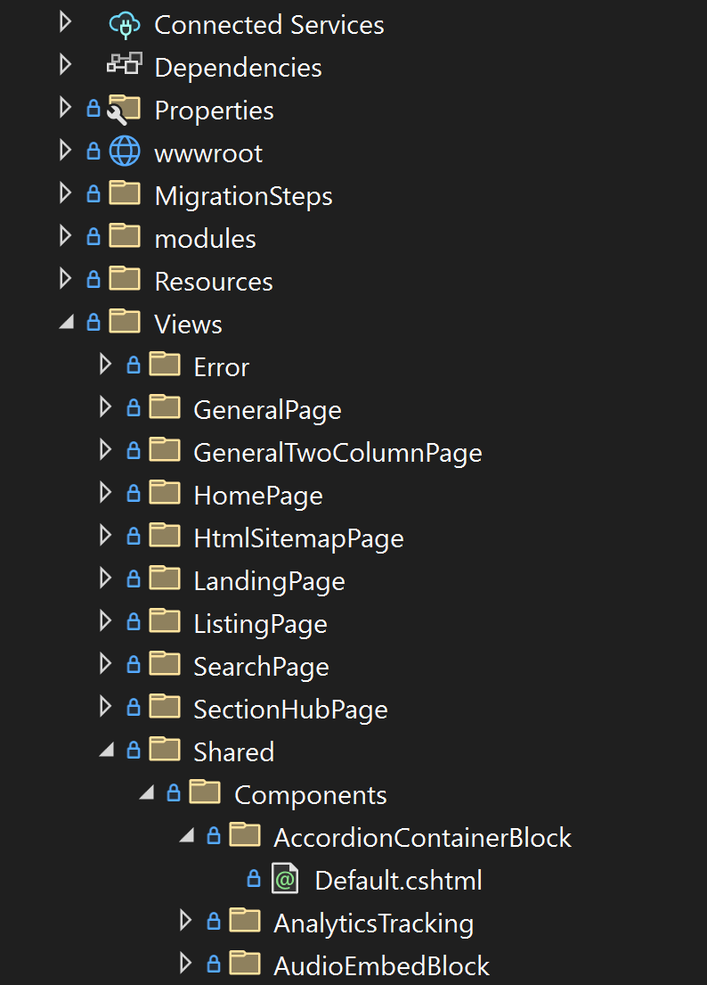 - AccordionContainerBlockViewComponent - this is the ViewComponent class which encapsulate all of the functionality for the accordion block feature