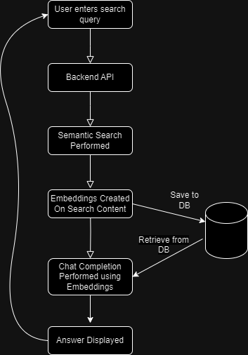 - Finally the Completion API is called (this API is deprecated and the Chat Completion API should now be used, but for the purposes of the POC I was fine with this) which utilises the initial search query, a prompt and the created embeddings to come up with an answer that relates to the user's initial intent.