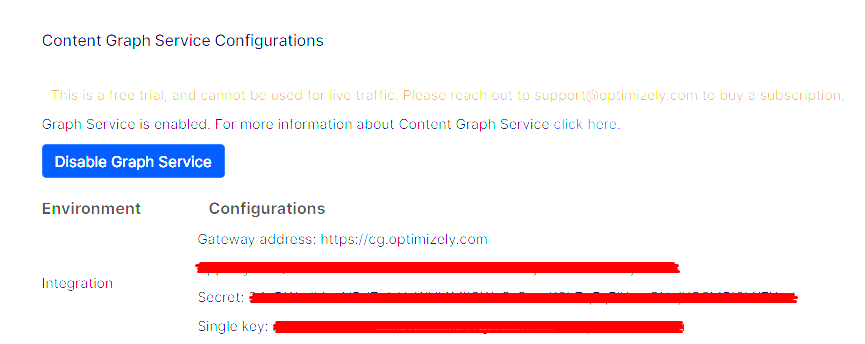 GatewayAddress– URL for the API Gateway. This value should be set tohttps://cg.optimizely.comfor all production environments.AppKey– Available via the Content Graph Service Configurations area of PaaSPortalSecret– Available via the Content Graph Service Configurations area of PaaSPortalSingleKey– Available via the Content Graph Service Configurations area of PaaSPortalAllowSendingLog– Flag that allows sending errors and warnings to the API Gateway. This data helps the support team investigate when something goes wrong. Defaults totrue.