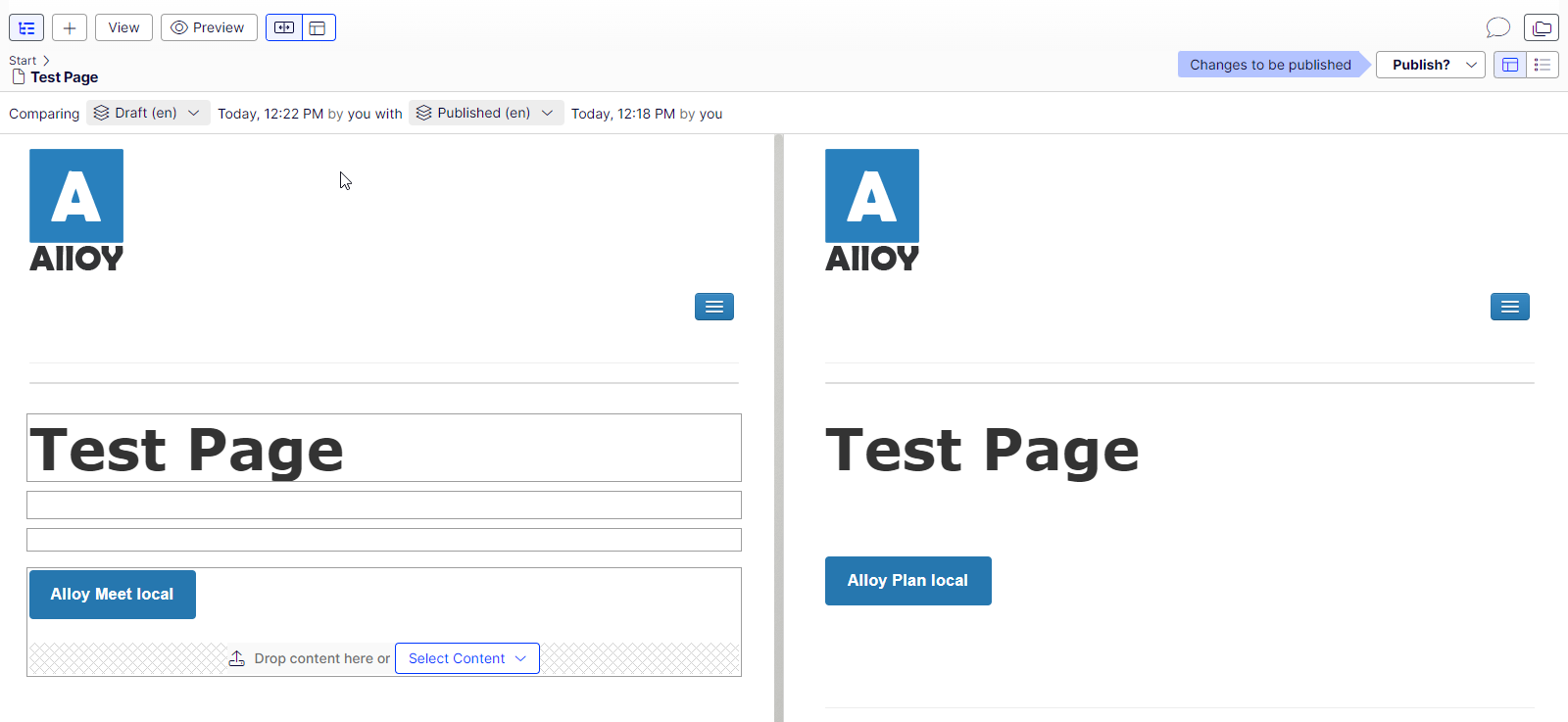 As you can see a new page version was created. We can easily preview how the page will look like after the changes. We can also use the compare mode: