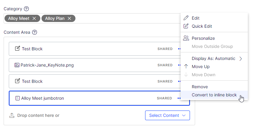 If you have existing local or shared blocks which you would like to inline into ContentArea properties then you have two options:
