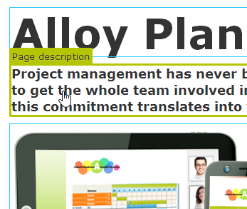 Effectively, every page you visit is loaded in an edit form and ready to be edited at any time. Unlike prior versions of EPiServer (and unlike a lot of other CMS), you don’t deliberately click an “Edit” link and move to a different view of the content (an edit form). Rather, you’re always in a “potential edit form.” At any time, you can click on a property (highlighted by the blue line, remember), and make a Property Edit. Every page you visit is standing at the ready, waiting to be edited.