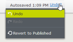 Making any Property Edit will trigger the autosave process. You can see the “Saving…” text at the top of the page. When it’s complete, this will indicate that the content has been saved, the time it was saved, and offer a link to Undo which drops down this interface (we’ll talk about the “undo” functionality at length below).