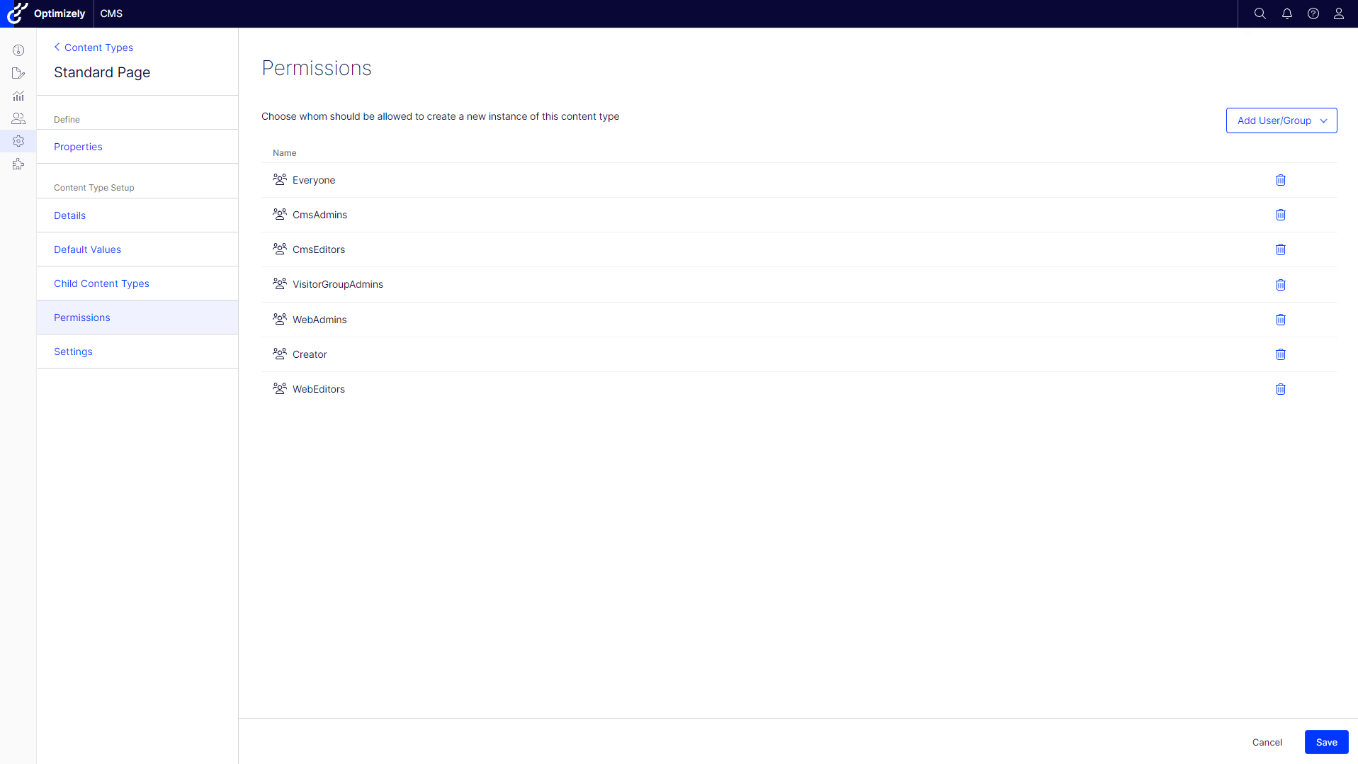 The Permission section allows you to configure access rights to the content type for specific groups and users.