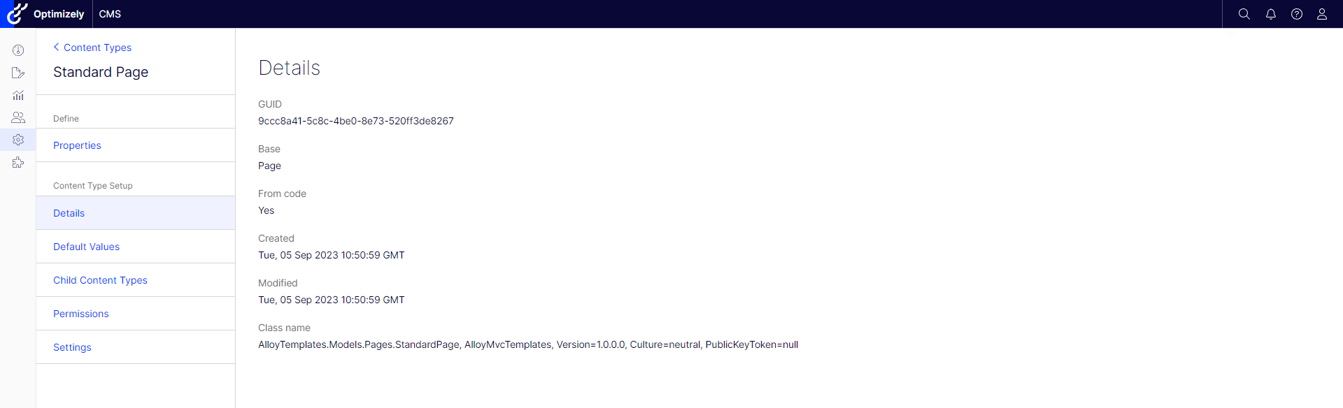 The "details" section contains basic, non-editable information about the content type, like GUID, created date and model type name. This section allows you to check database related fields and helps with troubleshooting.