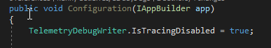 - https://learn.microsoft.com/en-us/dotnet/api/microsoft.applicationinsights.extensibility.implementation.telemetrydebugwriter.istracingdisabled?view=azure-dotnet#microsoft-applicationinsights-extensibility-implementation-telemetrydebugwriter-istracingdisabled
