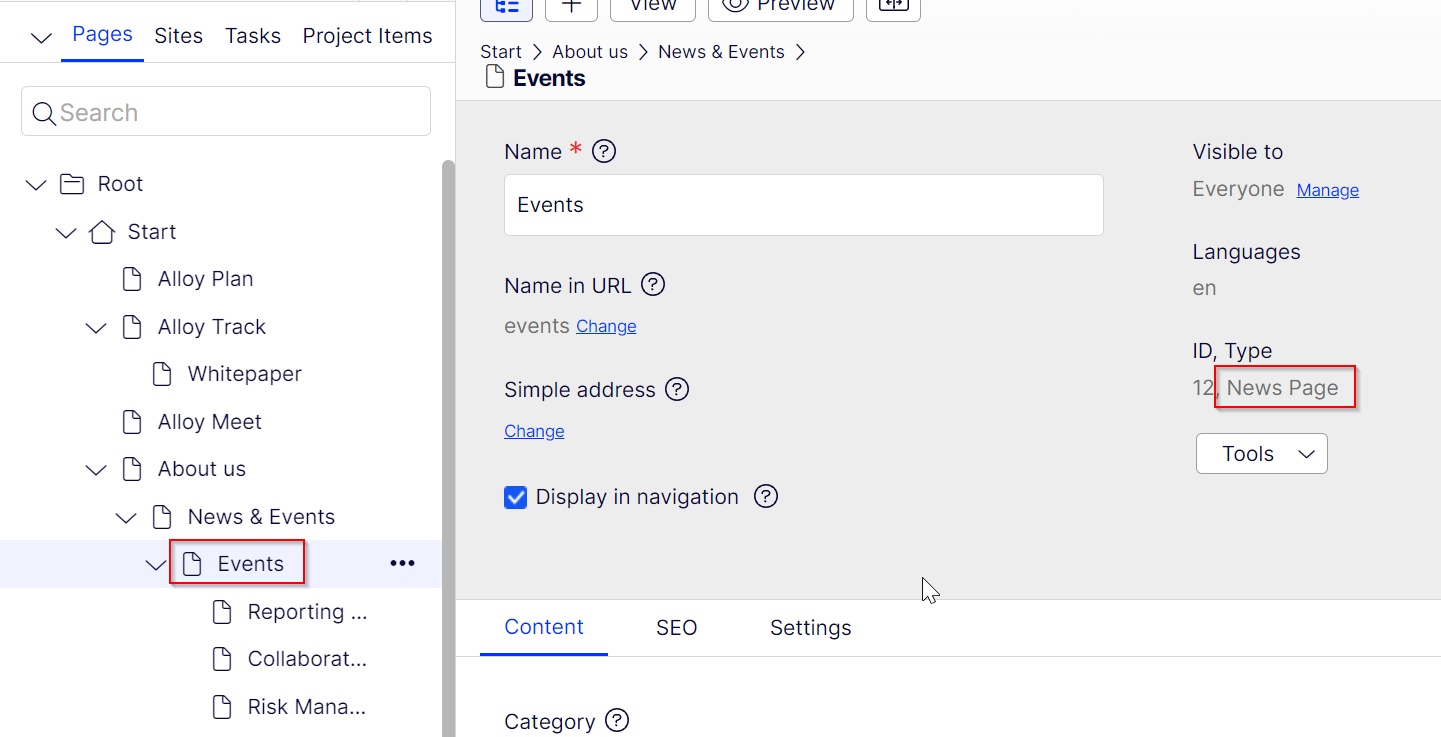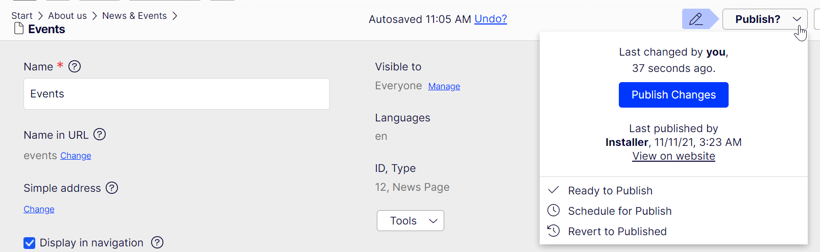 Going back to our Alloy example, if we edit something on the Events page (NewsPage) we can see that it is ready for direct publish, because the definitions were updated as soon as it Autosaved.
