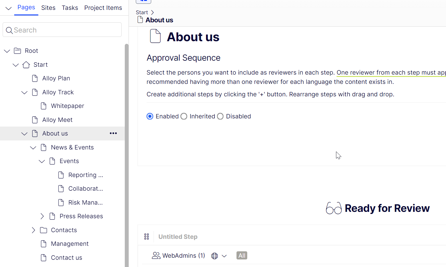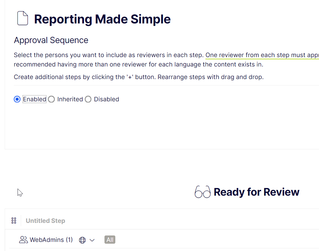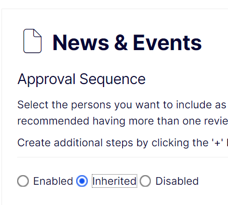 For any pagetype that is a NewsPage we use the ContentReference to get the definition (ApprovalDefinitionResolveResult) that applies to that specific node. ApprovalDefinitionResolveResult is an object that contains the Definition (ApprovalDefinition) and an IsInherited flag (bool) that signifies whether the definition comes from this node or is inherited from an ancestor.