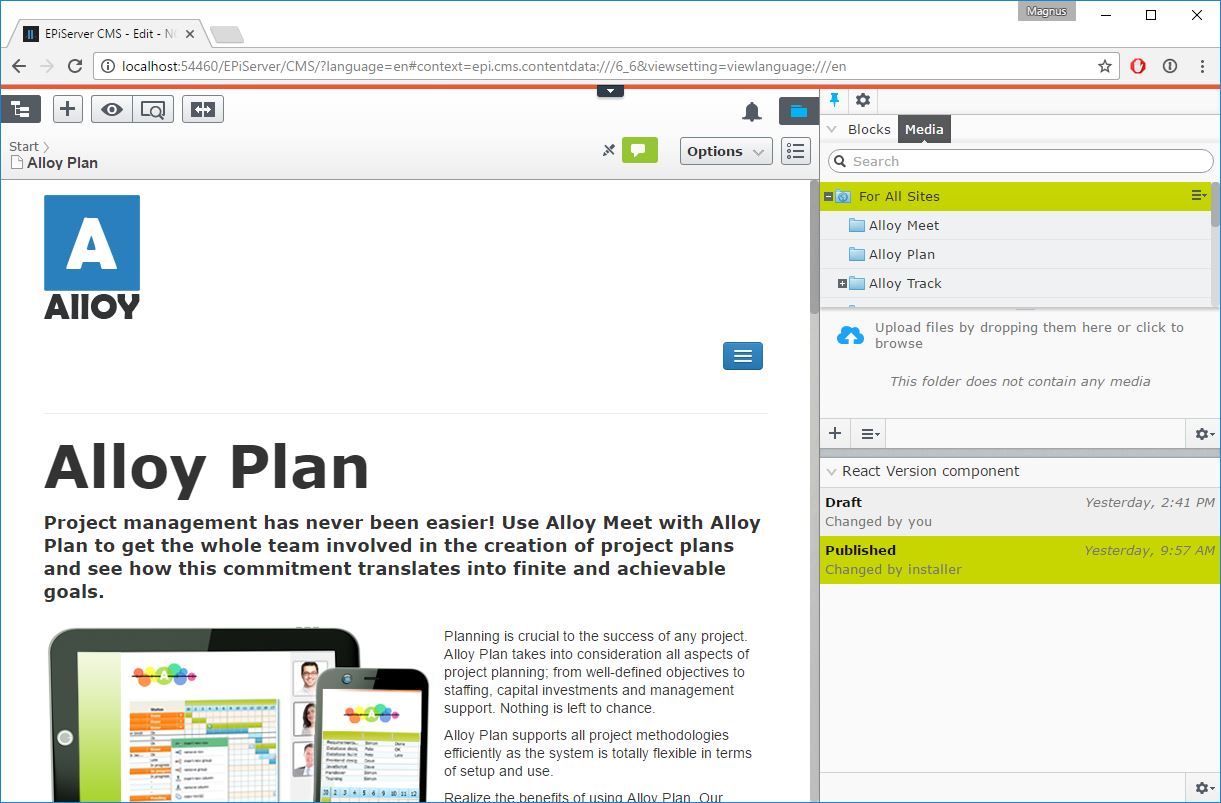 That is the short version on how you can create Dijit widget that renders a React Component in Episerver CMS. Have a look at the full source code of the .jsx file to see how to do cleanup when the widget is destroyed, it also contains the code for the Version React component.
