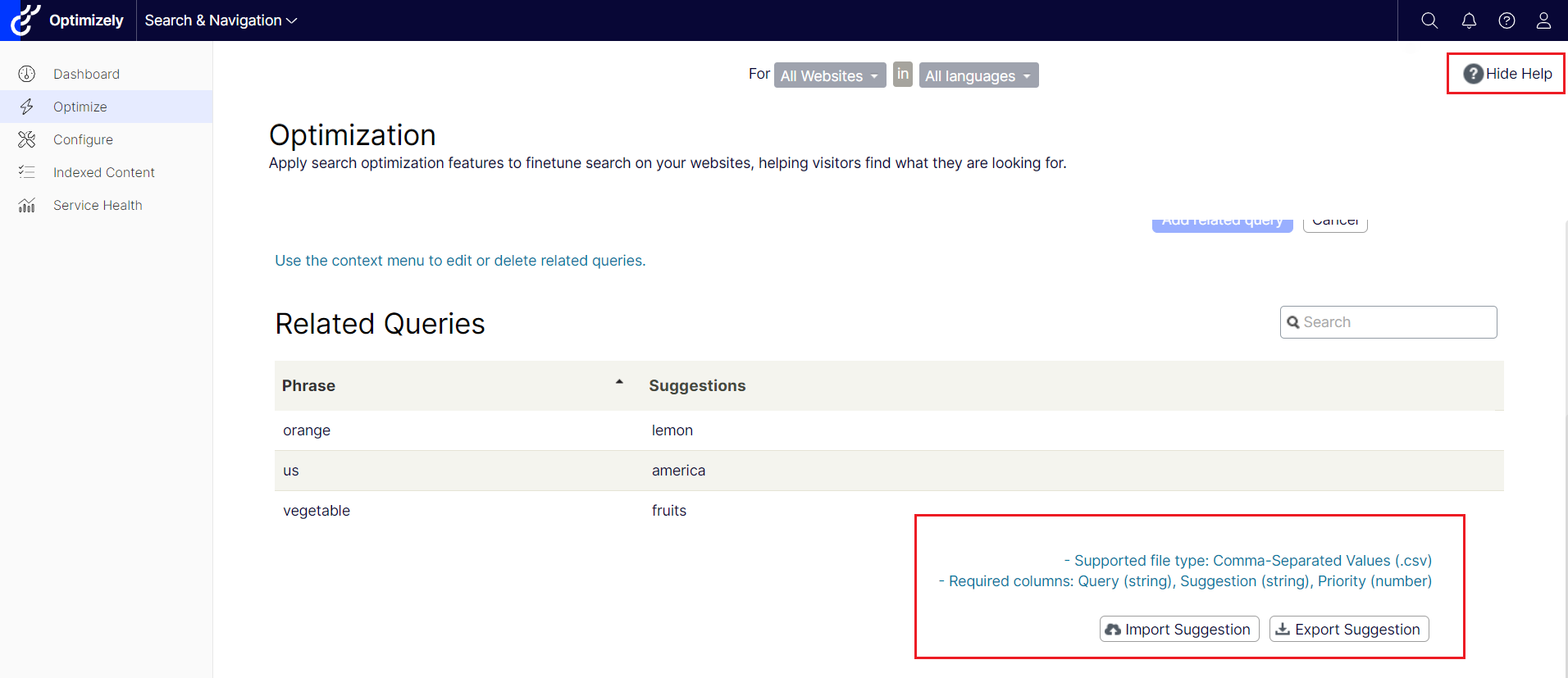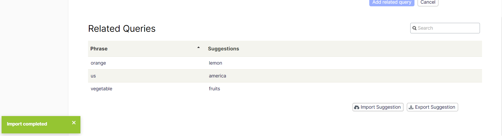 We introduce a small but helpful funcionality for customers which allow customers import/export list of Related Queries, Synonyms, Autocomplete and Connectors list on FIND 16.3.0.