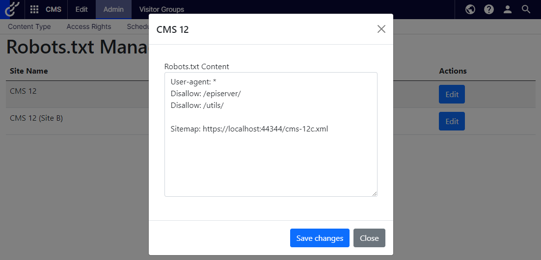 Stott.Optimizely.RobotsHandler is a new robots.txt handler for Optimizely CMS 12 that fully supports multi-site builds with potentially different robots.txt content to be delivered by site. This package is inspired by work previously delivered with POSSIBLE.RobotsTxtHandler which was built for CMS 11. Stott.Optimizely.RobotsHandler has been built from the ground up initially as a learning exercise building on lessons learned in my previous post: Extending The Admin Interface in Optimizely CMS 12.