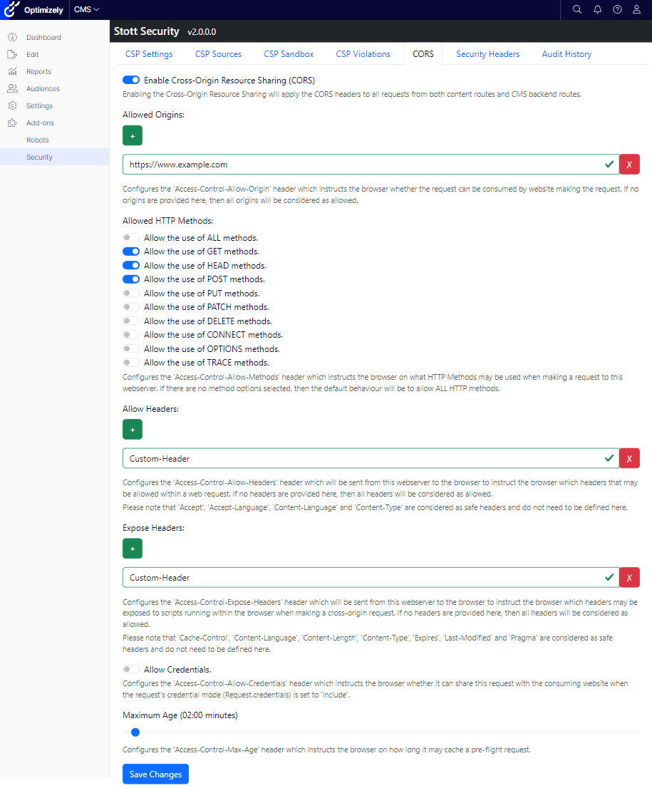 For further insights into the original CORS implementation within Stott Security, refer to Adding CORS Management to Optimizely CMS 12. Notably, this functionality has been updated to accommodate both fixed CORS policies in the code and the globally utilized policy by Stott Security.