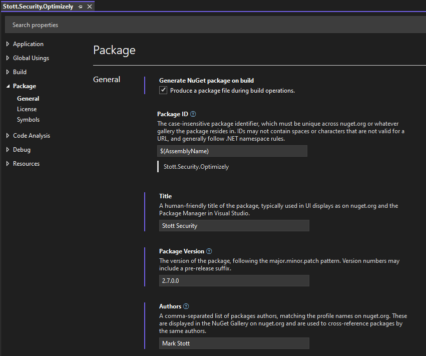 $(AssemblyName)variable, then this will match the name of the project. - Title : Visual Studio describes this as the name of the package used in UI displays such as Package Manager, but this largely does not get used.