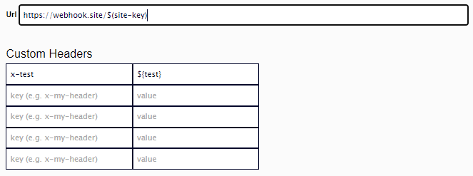 When creating a webhook, tokens can be used within the URL and custom header fields to allow information such as keys or environment-specific values to be pulled in. Tokens are in the format ${TokenName} where TokenName is a key registered using the RegisterPlaceholder(string token, string value) method of the IWebhookRepository. The value associated with the token will replace the token placeholder. In the event that the token name doesn't match a key, the token placeholder will be left as-is.