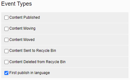 Reloading the screen, we can now see our friendly event name in the list of events and use it to fire a webhook the first time a content item is published in a given language.