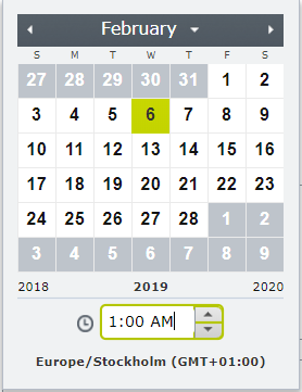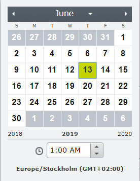 The date picker will now display the time zone (Firefox and Chrome only) and the GMT offset at the bottom of the date picker.