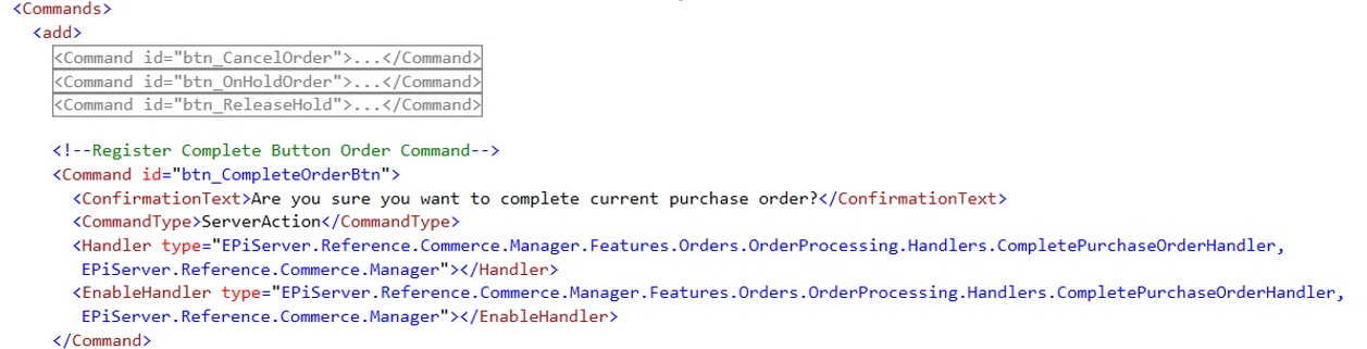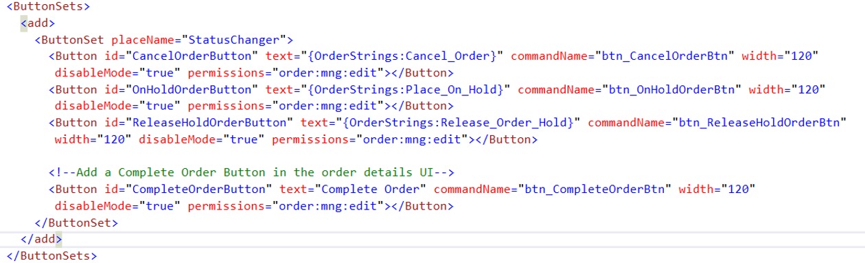 - Include the PurchaseOrder-ObjectView.xml in your solution, If you notice in this file you will find numbers are buttons are already added and display in the order summary section, so similarly add a new button with the command name ‘btn_CompleteOrderBtn’ and permissions.