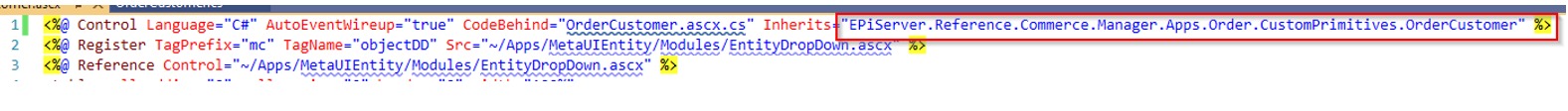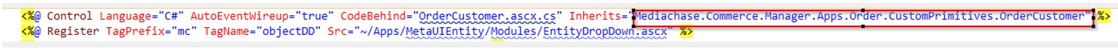 - Open OrderCustomer.ascx and copy the highlighted Inherits tag value (Mediachase.Commerce.Manager.Apps.Order.CustomPrimitives.OrderCustomer)and create the OrderCustomer.cs class and derived from the inherits value.
