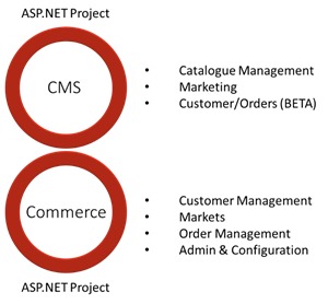 At the heart of it when you start developing, you’ll start by doing the same as a CMS build. Install the CMS via the VS Extension Once you have the CMS installed and configured, you create an empty asp.net project and install the correct Nuget packages in both the blank application and in the CMS application as explained here. As shown on the left, the blank application becomes the Commerce Manager application. |