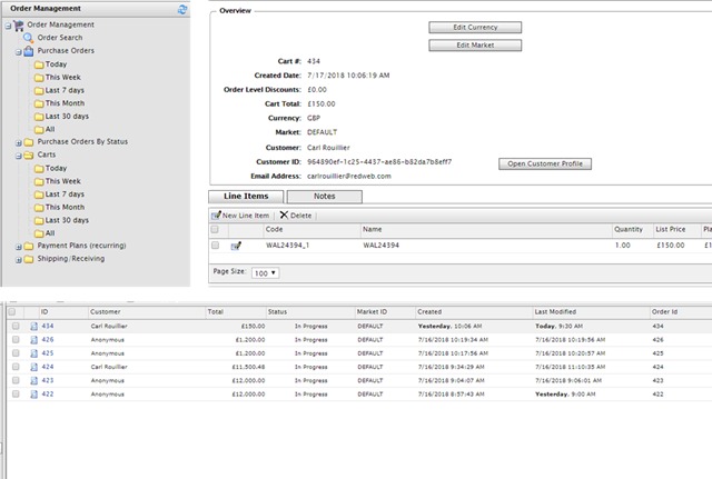 The order management area allows you to view all of these areas to find carts and purchase orders.