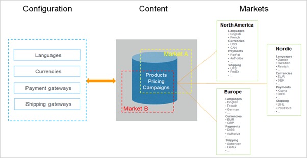 As you can see from the above the core point of markets is to allow your commerce content to be segmented based upon these combination of configuration options. In the above diagram we have used markets to represent regional areas (a common scenario) but these are flexible and can be used for anything where you need to group these options together.