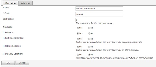 - Address – If this is a physical location you can configure the address for this warehouse. This would for example allow you to show the users the distance from the nearest fulfilment center so they can see more personalized and localize search results.