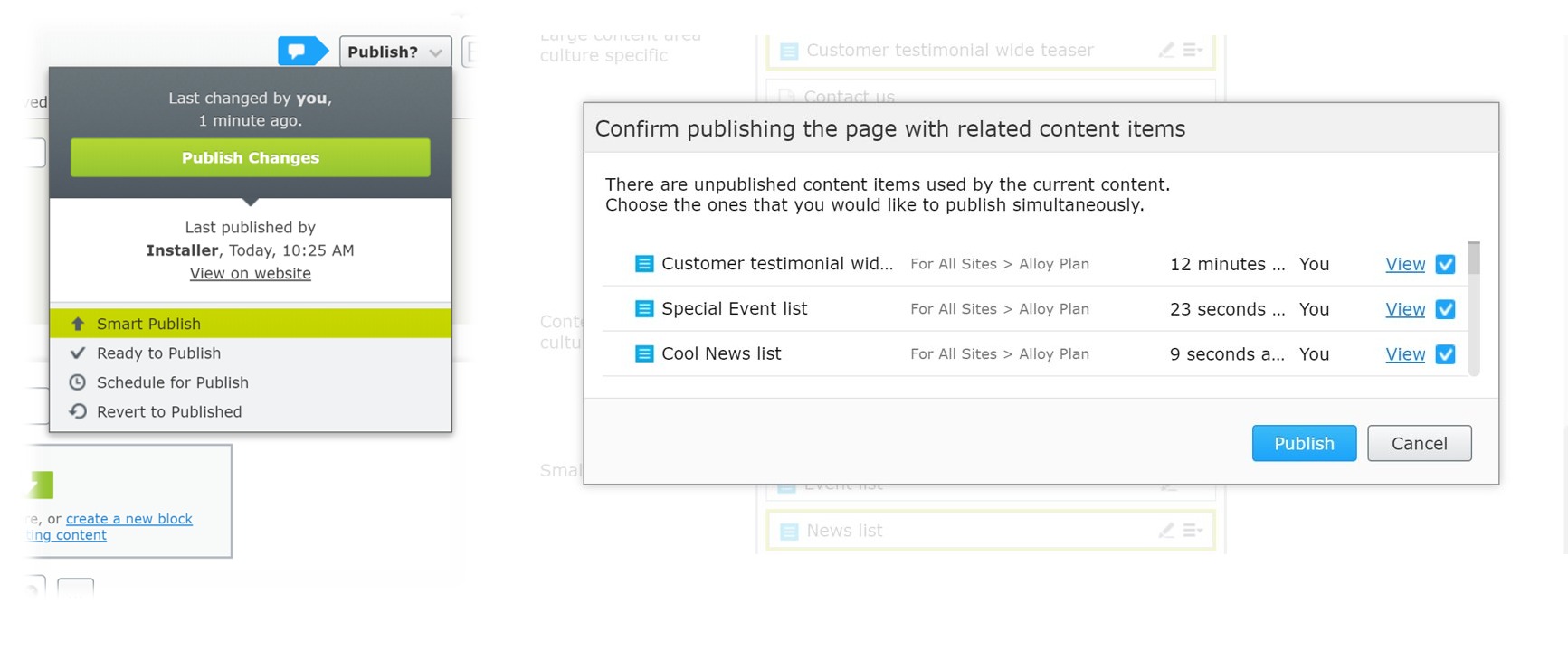 Just for recap and to put everything in context I have taken screenshots of each publish feature.