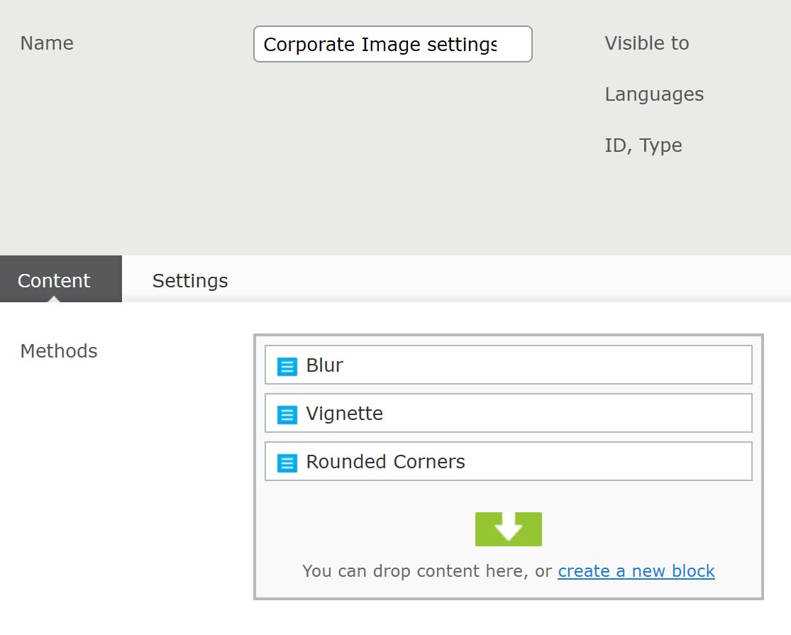 Remember, just as when using the fluent API, the order in which the methods are processed is important. Doing rounded corners before a vignette effect for example has a different effect than doing that the other way around (see below). Fortunately the content area in both the Process Image block and the Method Collection Block allows for re-ordering of the selected methods.