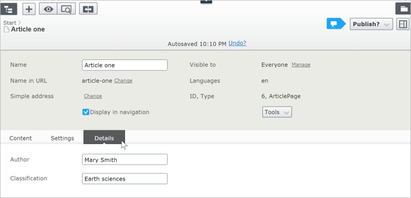 Example: The Article page has two properties - Author and Classification, which are displayed under a tab named Details. The Author property will be displayed first on the tab, since it has the lowest sort order number.