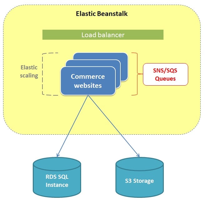 Like an EPiServer CMS webite on Amazon, the Commerce website can be run in an AWS Elastic Beanstalk environment with caching and multiple instances. The website instances share the same Amazon SQL instance, and the S3 storage in Amazon is used for storing of the file binary data. Load balancing is applied, and the Amazon SNS manages events between the Commerce websites.