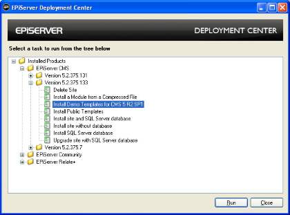 - Expand the EPiServer CMS version for which the Demo Template belongs to (5.2.375.133) and select “Install Demo Templates” and then click “Run”.