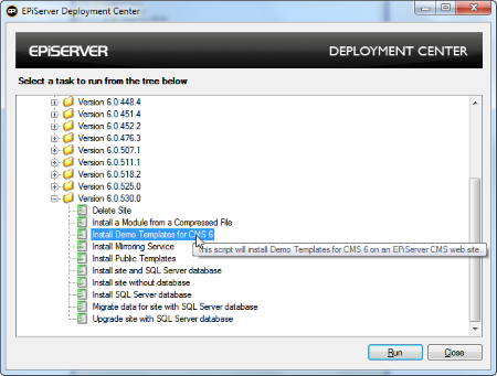 - Expand the EPiServer CMS version for which the demo templates belongs to (6.0.530.0) and select “Install Demo Templates for CMS 6” and then click “Run”.