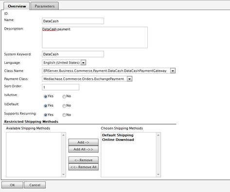 - Class name: EPiServer.Business.Commerce.Payment.DataCash.DataCashPaymentGateway