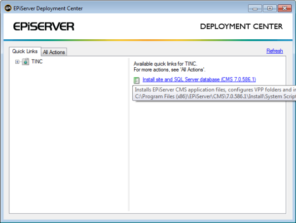- Under Quick Links, select Install site and SQL Server database (CMS 7.0.586.1).