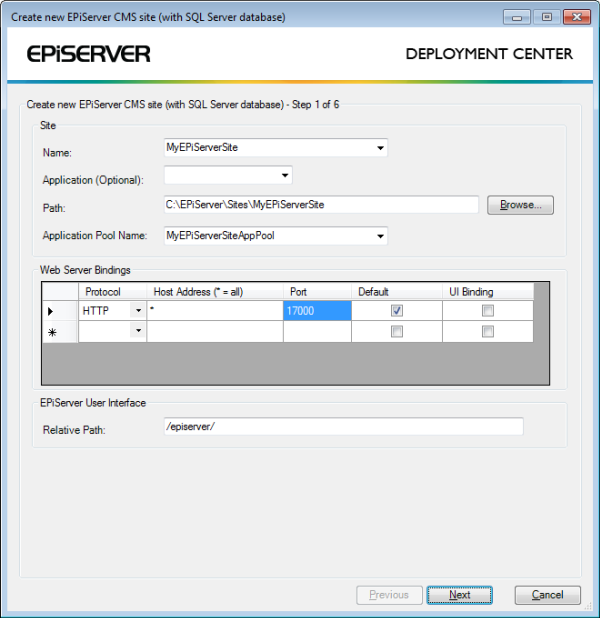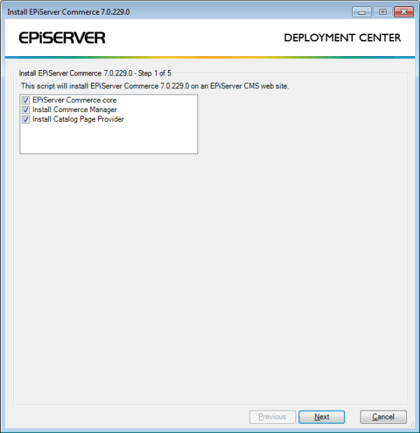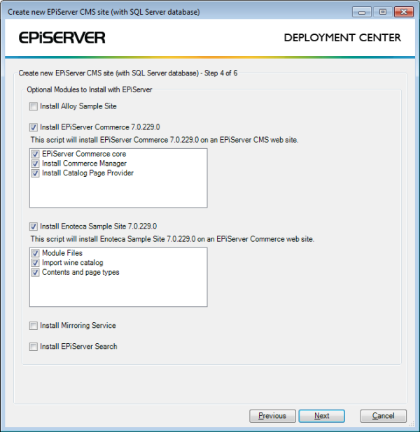 - In the next dialog, select options as shown below, for EPiServer Commerce and the Enoteca sample site: