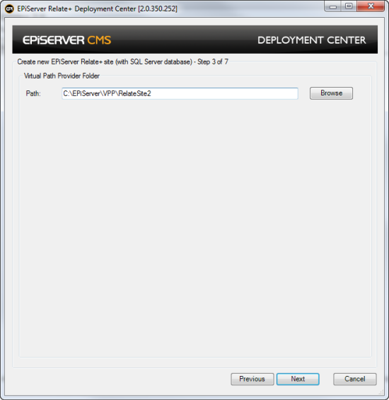- In the Path field, select or create the folder where Virtual Path Provider files will be stored for the site. Each VPP will create a child folder under the folder selected in the wizard.