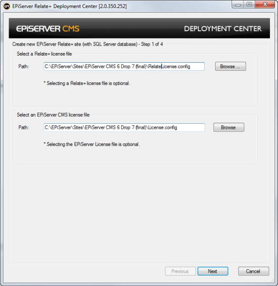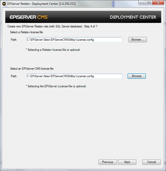 - Provide paths for the license configuration files that you want to use for the site, one for Relate+ and one for EPiServer CMS. This is optional at this point, if omitted the site will be created but will report licensing errors.
