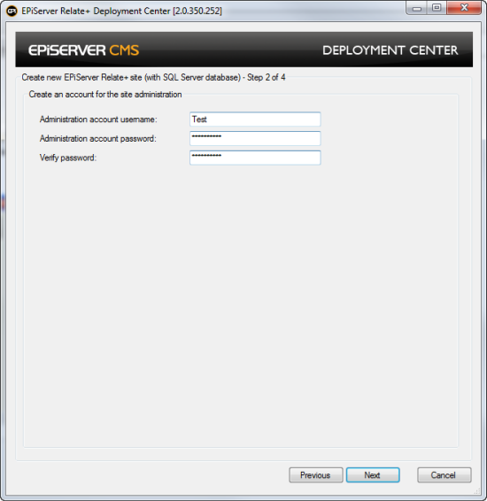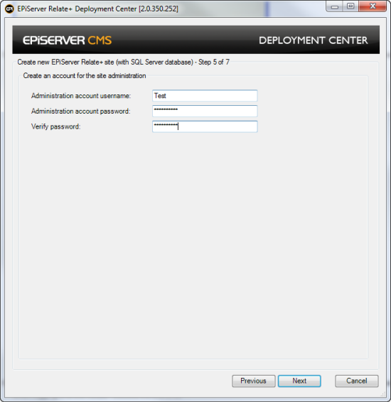 - Create an account for the site administration, provide Administration account username/password. This will be used when logging in to the Relate+ website the first time.