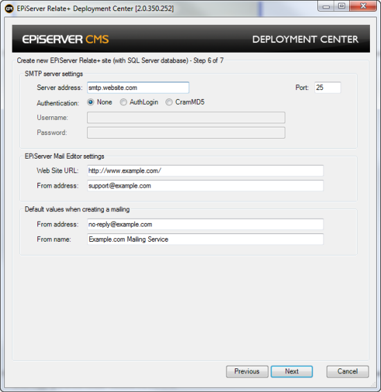 Server Address: Enter the name of the SMTP Server instance to use and the Port number. This is the mail server from where the e-mail messages will be sent - if it is the same server as where the EPiServer CMS website resides entering localhost should be sufficient.