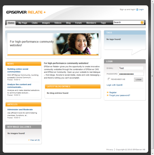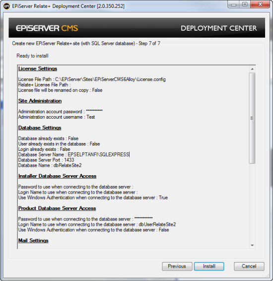 - When the installation is finalized, the new Relate+ site will be opened, and you can login using the administration account created earlier. If the site is not opened in a Web browser, click Finish to finalize the installation. Use the IIS Manager to manually start the site if required. Opening the EPiServer Deployment Center from the programs menu will give you various options to continue working with your Relate+ website.