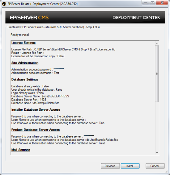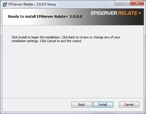 The Relate+ download zip file contains the Microsoft Installer files and the Setup.exe. Running the "Setup.exe" file will start the installation of the various components, the EPiServer Deployment Center and optionally a database and an example website.